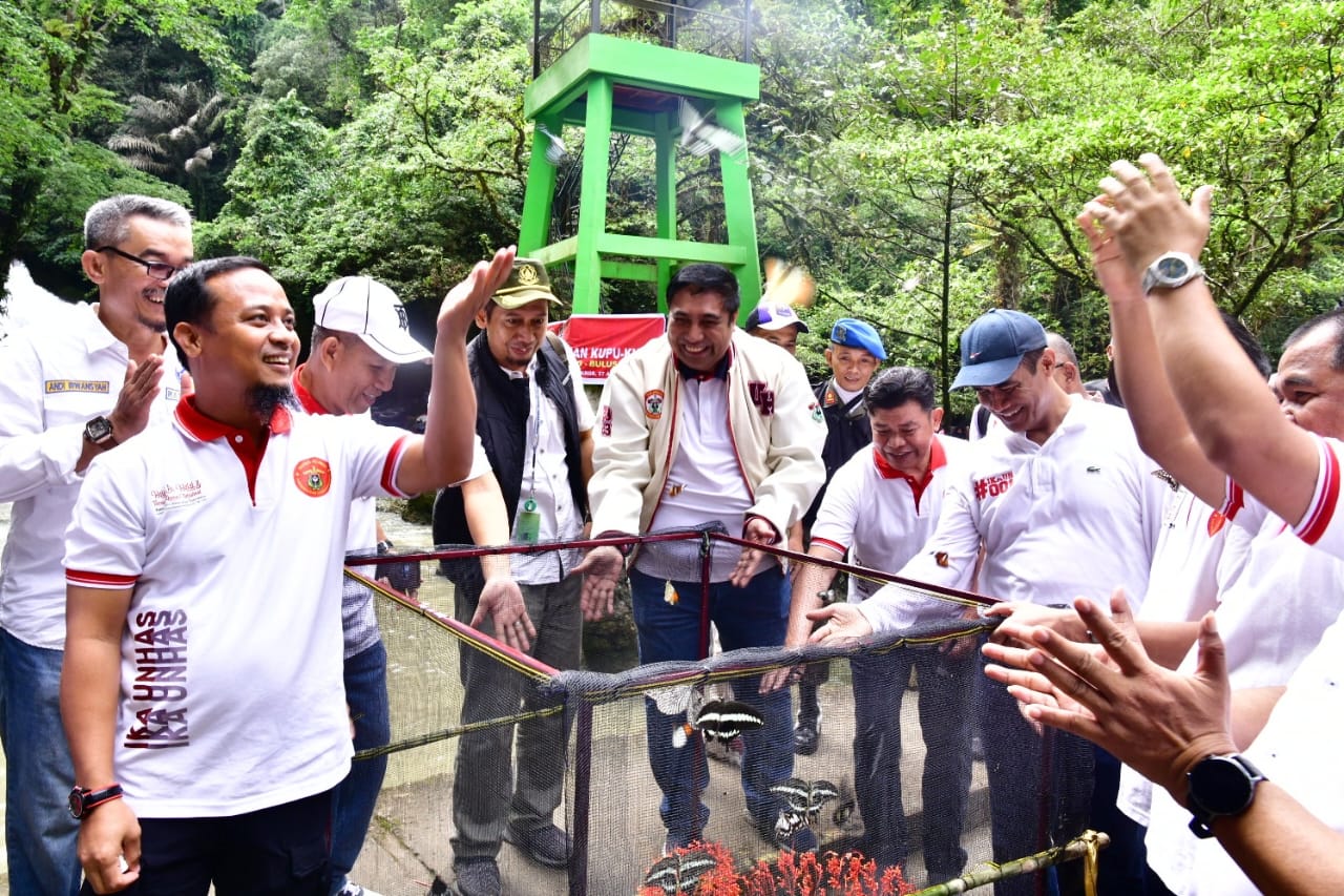 LANGITKU.NET, Maros – Gubernur Sulawesi-Selatan Andi Sudirman Sulaiman bersama Ketua Umum IKA (Menteri Pertanian RI 2014-2019), Andi Amran Sulaiman, Rektor Unhas, Prof. Jamaluddin Jompa dan Bupati Maros, Andi Syafril Chaidir Syam melepas 19 jenis spesies kupu-kupu dan menanam bibit pohon endemik eboni (kayu hitam) di kegiatan Halal Bi Halal dan Temu Nasional Ikatan Keluarga Alumni (IKA) Universitas Hasanuddin (Unhas) di Taman Wisata Alam Bantimurung, Kabupaten Maros, Kamis, 27 April 2023.