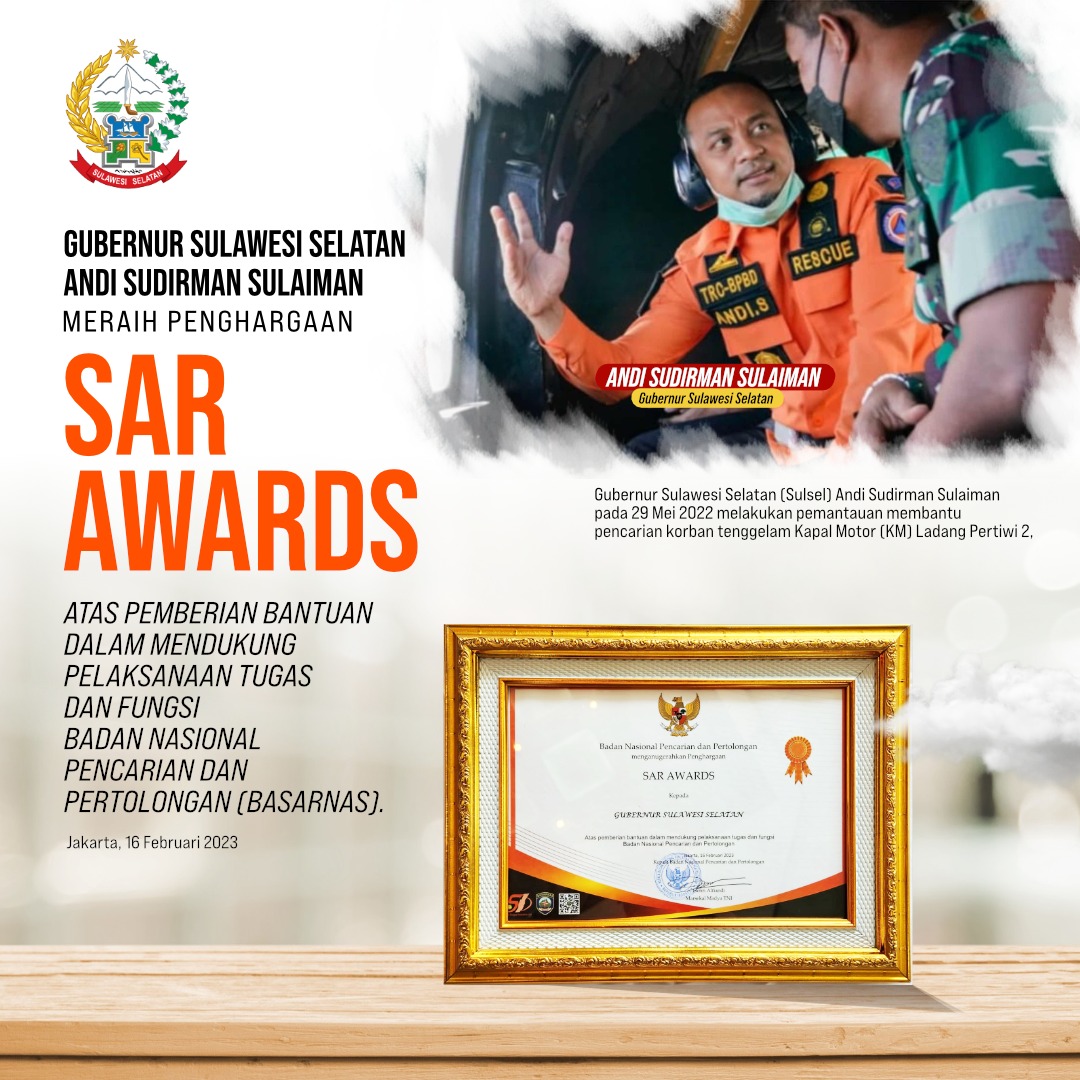 “Alhamdulillah menerima Penghargaan SAR AWARDS dari Badan Nasional Pencarian dan Pertolongan (BNPP/Basarnas) di Rapat Kerja dan Forum Koordinasi Potensi Pencarian dan Pertolongan (FKP3) 2023,” kata Gubernur Andi Sudirman.