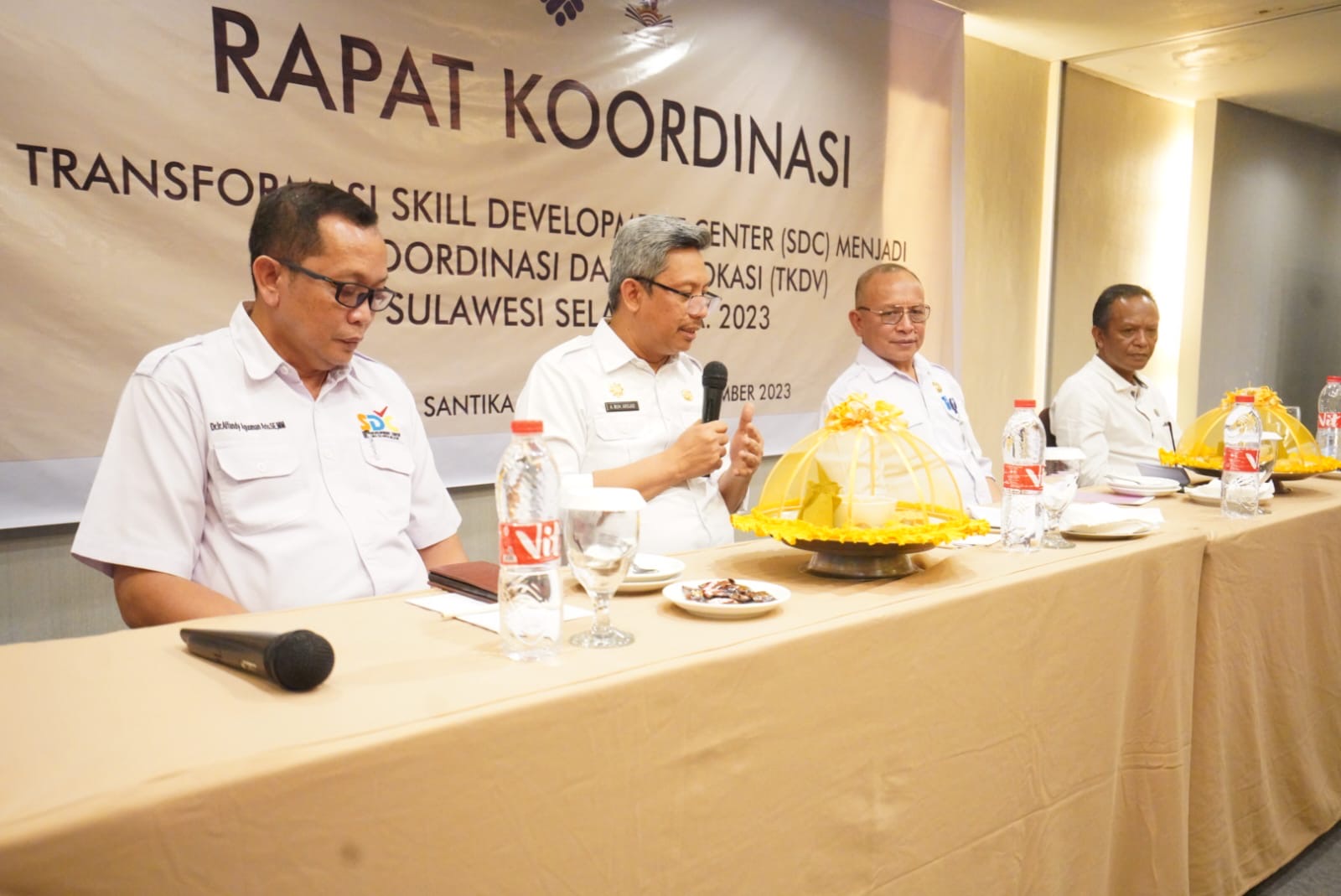 LANGITKU.NET, Makassar – Penjabat Sekertaris Daerah Provinsi Sulawesi Selatan Andi Muhammad Arsjad menjadi narasumber dalam Rapat Koordinasi Transformasi Skill Development Center (SDC) Menjadi Tim Koordinasi Daerah Vokasi (TKDV) Sulawesi Selatan Tahun Anggaran 2023 di Hotel Santika, Makassar, Rabu 27 Desember 2023.