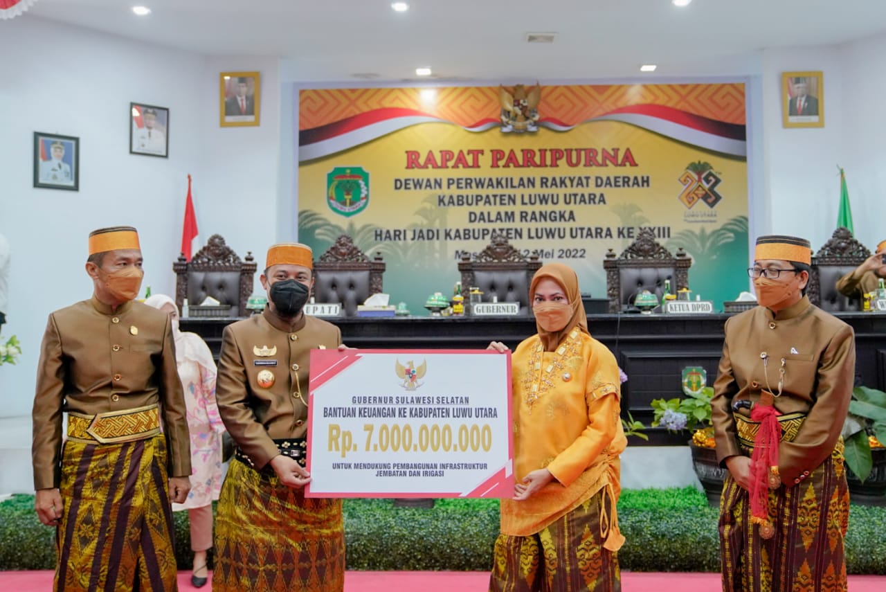Yang diserahkan oleh Gubernur Sulsel, Andi Sudirman Sulaiman kepada Bupati Lutra, Indah Putri Indriani pada acara Rapat Paripurna DPRD Lutra dalam rangka 23 Tahun Kabupaten Luwu Utara, Kamis (12/5/2022).