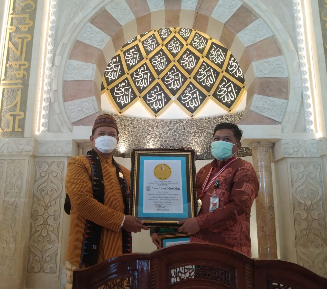 Pada akhir acara, Kepala Dinas Kominfo-SP Amson Padolo mewakili Pemprov Sulsel menerima Piagam Penghargaan dari LEPRID atas prestasi Pendukung Rekor Khotbah Jumat Seragam se-Sulawesi Selatan dalam Rangka Sosialisasi dan Literasi Analog Switch Off (Digitalisasi Penyiaran). Piagam penghargaan juga diserahkan kepada MUI Sulsel, KPID Sulsel, serta Pemkot Makassar atas ide, gagasan, serta keberhasilan terselenggaranya acara tersebut. Hadir juga Kabid Humas dan Komunikasi Publik Diskominfo Sulsel Sultan Rakib dalam acara tersebut. (*)