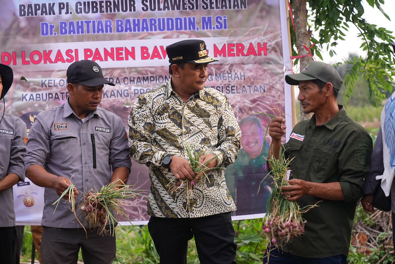 LANGITKU.NET, Enrekang – Fenomena El Nino yang mengakibatkan kemarau berkepanjangan, turut memengaruhi produksi bawang merah di Enrekang. Meski demikian, Penjabat Gubernur Sulsel, Bahtiar Baharuddin bersama para petani, masih bisa melakukan panen raya bawang merah di Desa Pekalobean, Kecamatan Anggeraja, Kabupaten Enrekang.