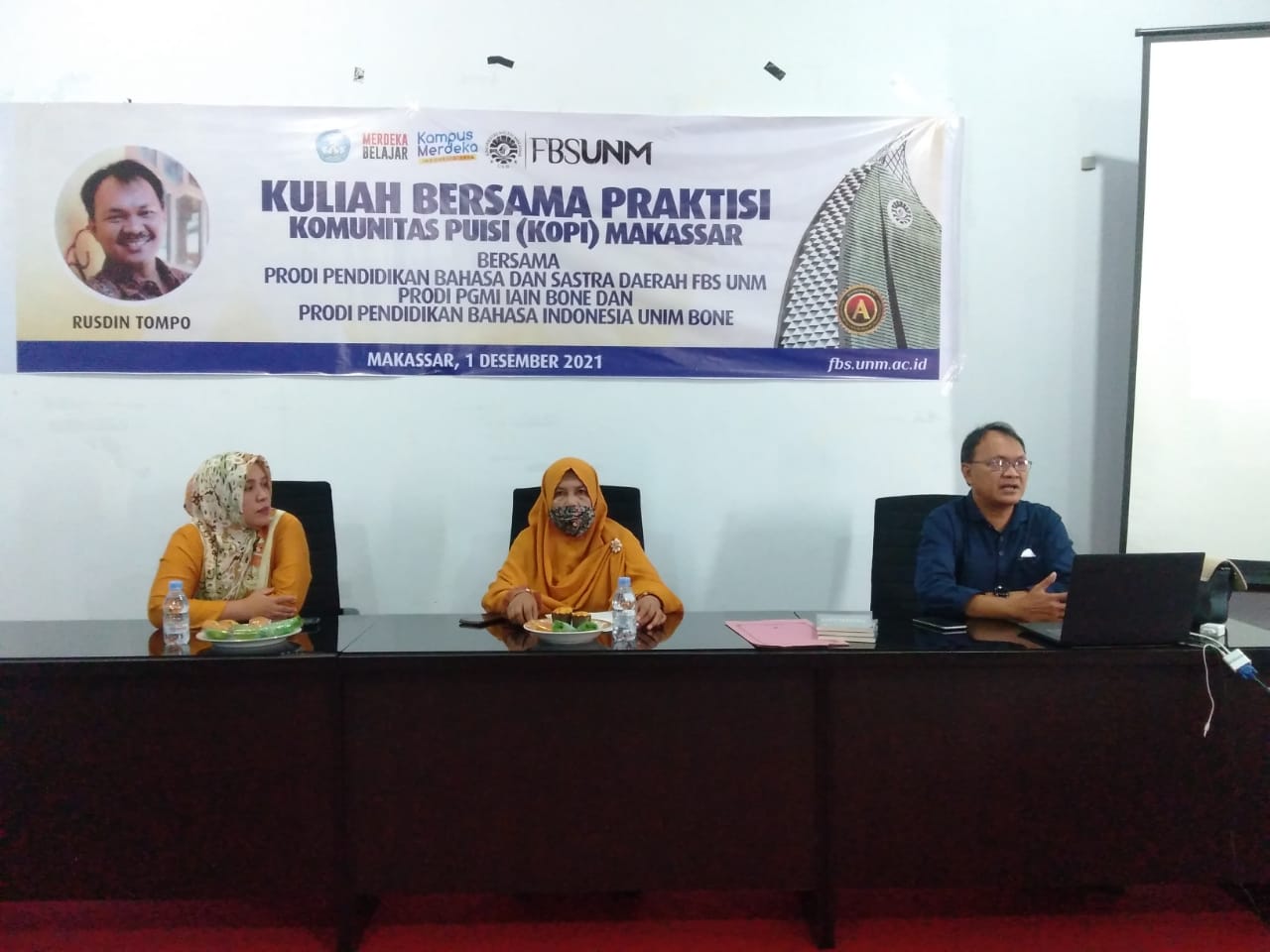 Rusdin Tompo hadir di kampus yang berada di Parang Tambung itu dalam kegiatan kuliah bersama praktisi, sebagai tindak lanjut kerja sama antara Prodi PBSD FBS UNM dengan Komunitas Puisi (KoPi) Makassar. KoPi Makassar merupakan wadah sejumlah penulis, penyair, sastrawan, dan penggiat literasi berinteraksi agar terus produktif berkarya.