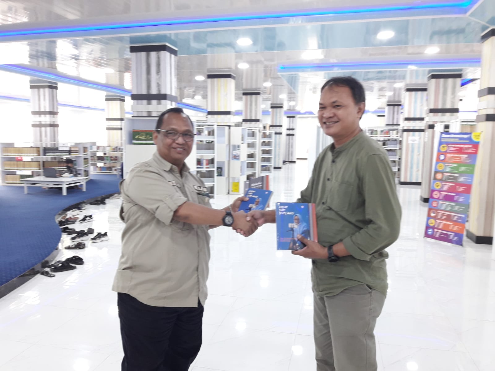 Rusdin Tompo menyerahkan 2 buku, masing-masing, “Kabar dari Sekolahku” (dia sebagai penulis) dan “Maharku: Pedang dan Kain Kafan” yang ditulis Rahman Rumaday (dia sebagai editor) kepada Mohammad Hasan Sijaya, SH, MH, Kepala Dinas Perpusrakaan dan Kearsipan (DPK) Provinsi Sulawesi Selatan.
