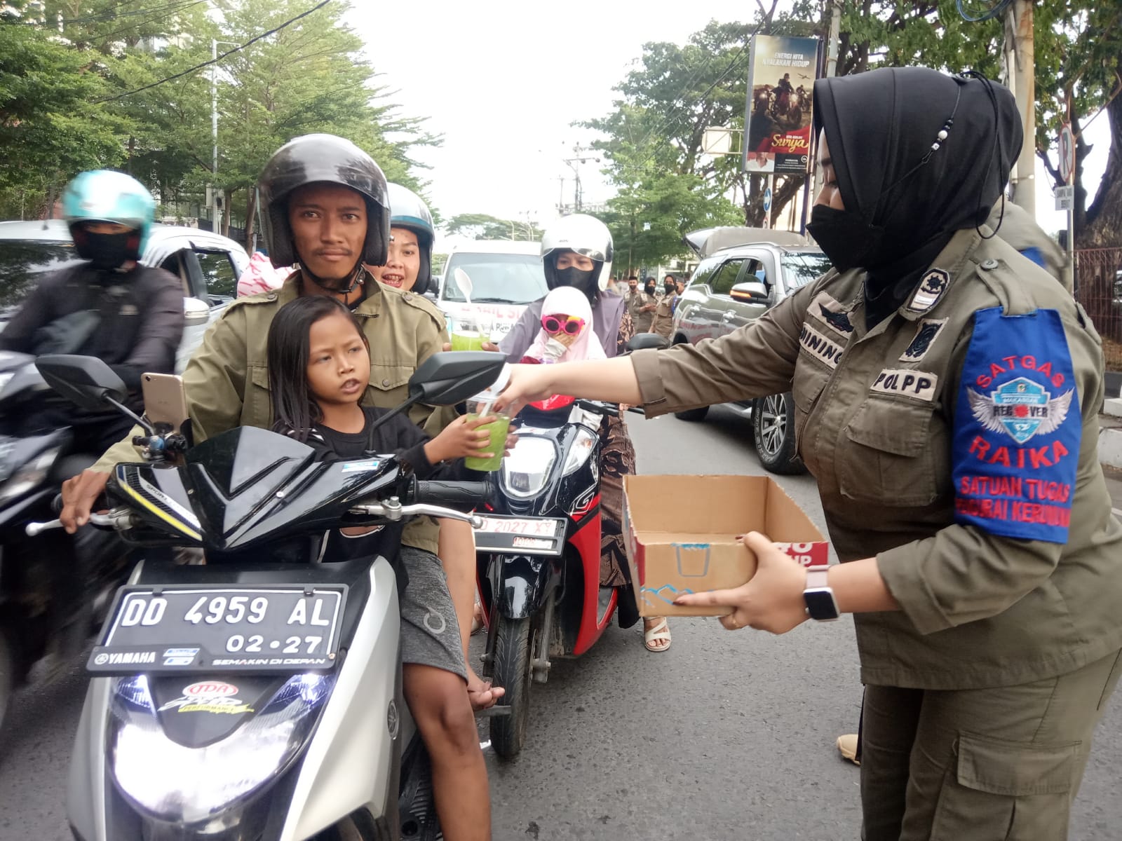 Mengunakan seragam, Satpol PP membagikan makanan buka puasa di pintu masuk Anjungan Pantai Losari Makassar, Jalan Riburane, Ujung Pandang, Makassar, Sulawesi Selatan (Sulsel). Pengendara yang melintas terlihat diberi satu paket makanan untuk berbuka puasa.