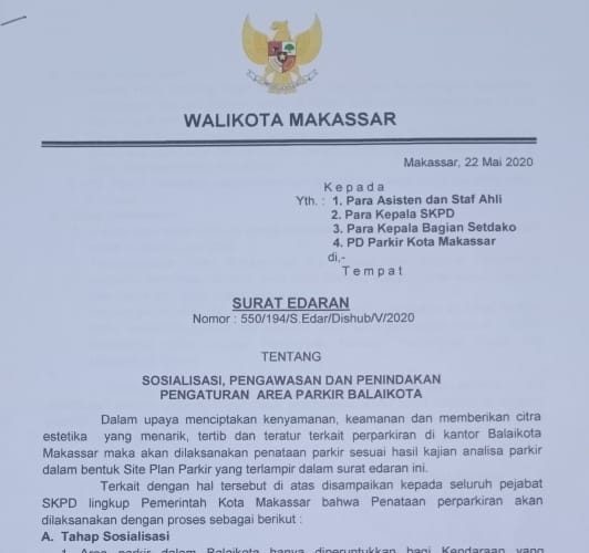 LANGITKU NETWORKS, Makassar – Pemerintah Kota Makassar melalui Pj Wali Kota Prof Yusran Yusuf menerbitka Surat Edaran Wali Kota tentang sosialisasi, pengawasan dan penindakan pengaturan area parkir Balaikota. Ke depan, seluruh staf dan pegawai Pemkot Makassar tidak diperkenankan lagi memarkir kendaraannya di Balaikota. Semua telah disiapkan area parkir di Karebosi Link dan Kanrerong.